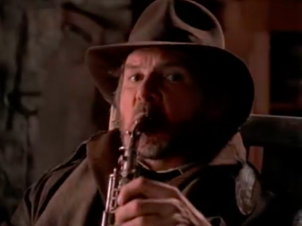 Then it cuts back to Harrison Ford and Grey Cloud who just got robbed. And Harrison Ford is sad too so he too plays the saxophone and that causes a mini-avalanche that collapses on their robbers???