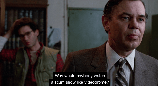 What I love about Videodrome so much – besides the obvious badass filmmaking makeup and body horror shit going on – is how messy Cronenberg deals with the themes. Sure, there is a right wing reactionary conspiracy about sex and violence and all that shit. But Cronenberg does not shy away from the fact that movies and television very obviously have a huge impact on how people perceive and make sense of the world. The images and ideas and themes and beliefs we consume passively on screen have a major impact on our brains. That does not mean we can excuse censorship, but it does mean we need to acknowledge the reality of that situation.