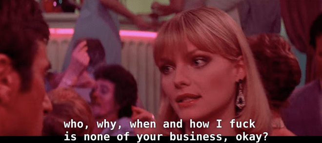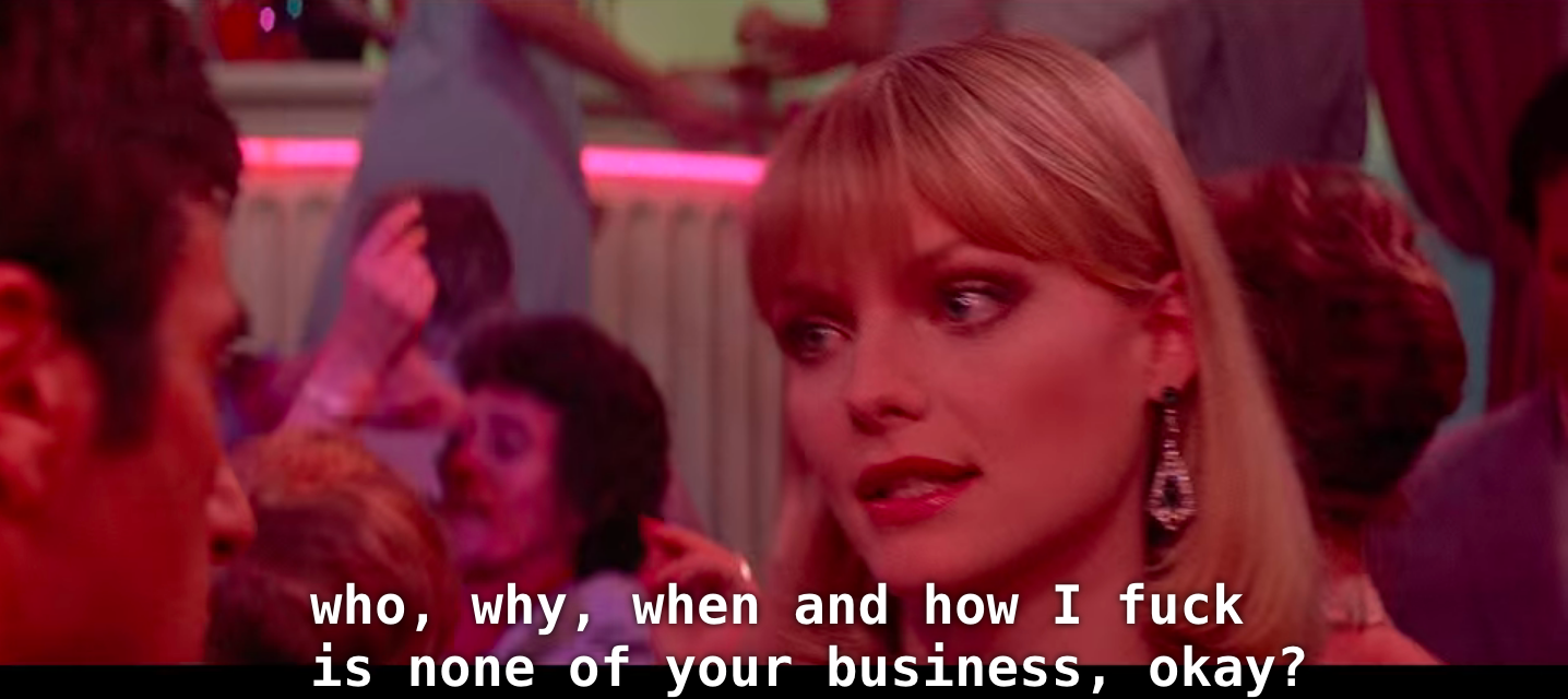 Al Pacino and Sean Penn in particular are struggling with this idea. In this country (and in this world, I suppose) it can often feel like you are born to have a certain kind of life. Al Pacino doesn’t want to be a drug criminal. Sean Penn wants to be a tough guy. But Al Pacino keeps getting sucked back in, and Sean Penn cannot help but be a nebbish nerd who is only playing tough.